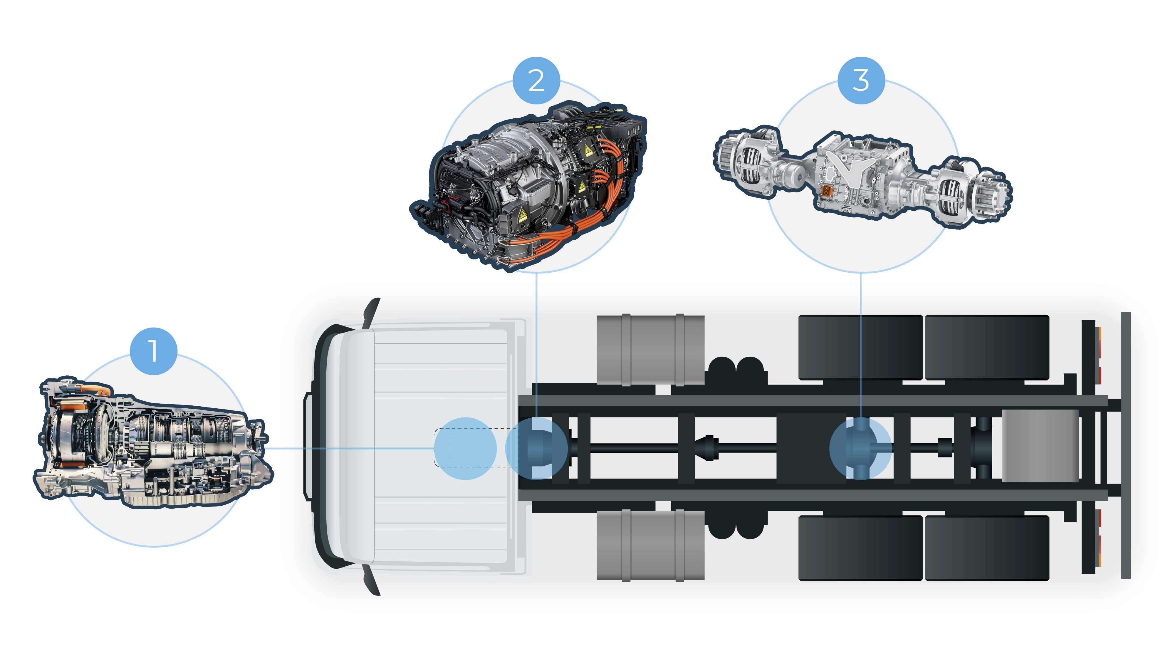 Dans le schéma du bas nous voyons que la quasi totalité de la chaîne de traction est regroupée derrière la cabine hormis la transmission ainsi que le moteur électrique.