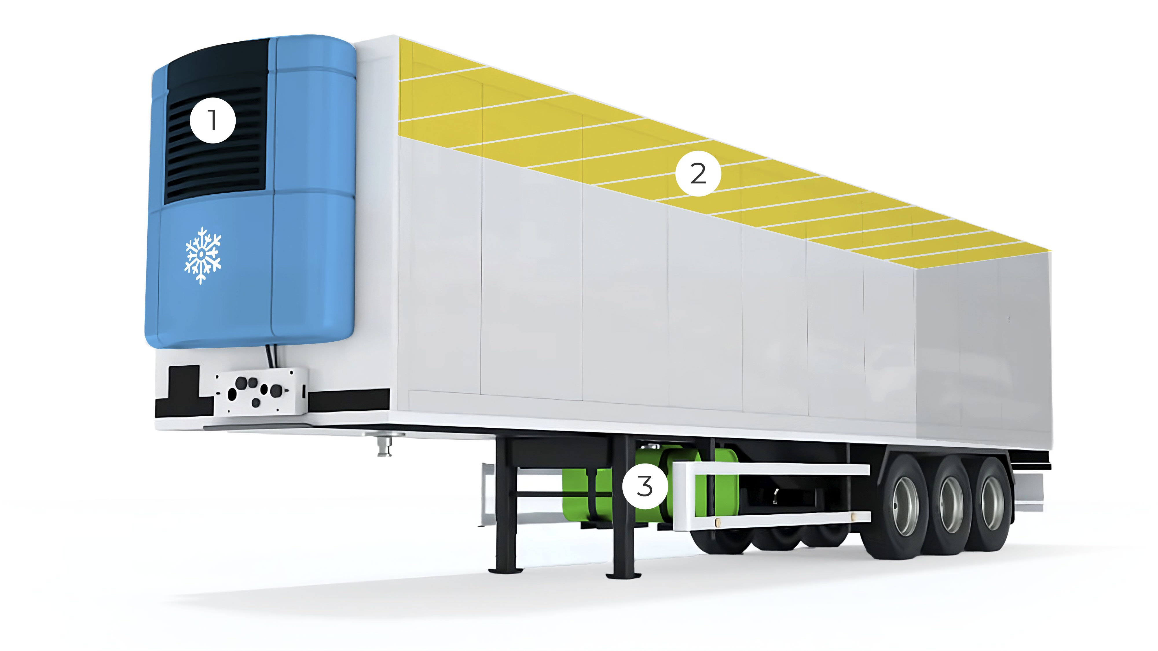 2 : Panneaux solaires. Ils ne recouvrent pas nécessairement la totalité de la remorque. Ils permettent de recharger la batterie d'autonomie dans des conditions favorables.