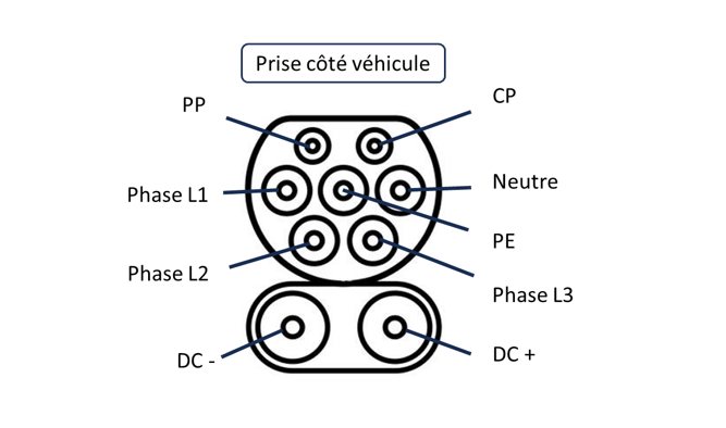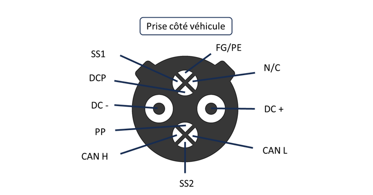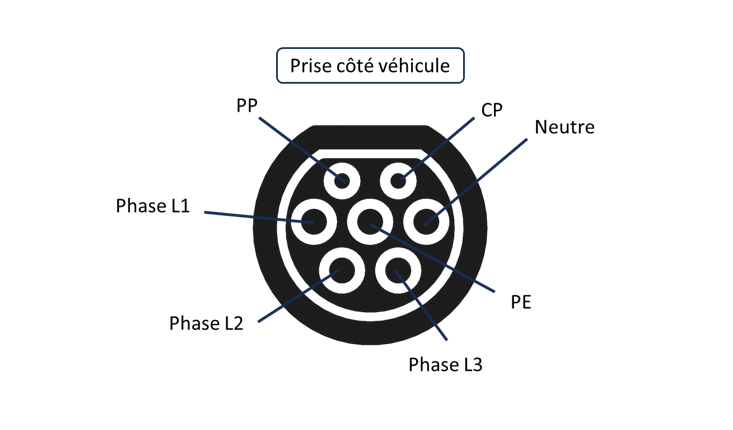 PE : Protective earth, Liaison à la terre de l'installation électrique de recharge. Cette voie est en liaison directe avec la masse du véhicule.
