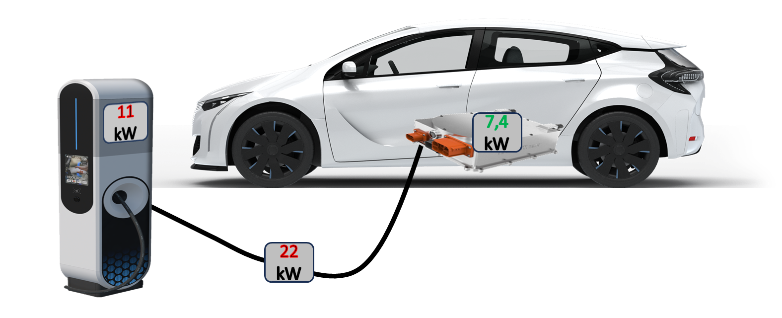 Sur l'illustration suivante, on retrouve sur chaque composant la puissance maximum qu'il peut fournir ou accepter. Dans cet exemple, même si le véhicule est branché avec un cordon acceptant 22kW, sur une borne de 11 kW, le véhicule ne rechargera qu'à 7,4kW. C'est bien le plus faible qui l'emporte, ici c'est le chargeur du véhicule qui va limiter la puissance de charge.