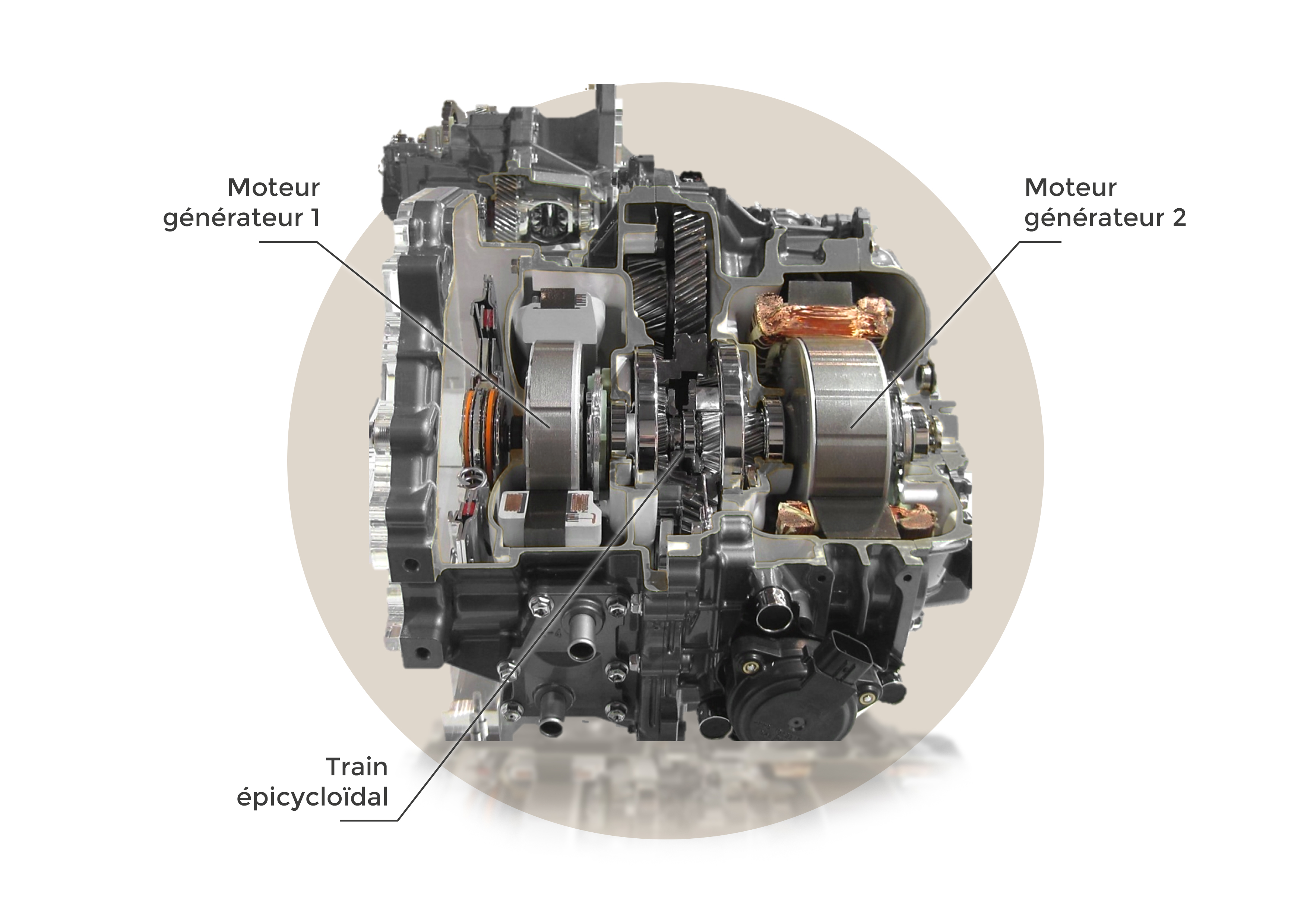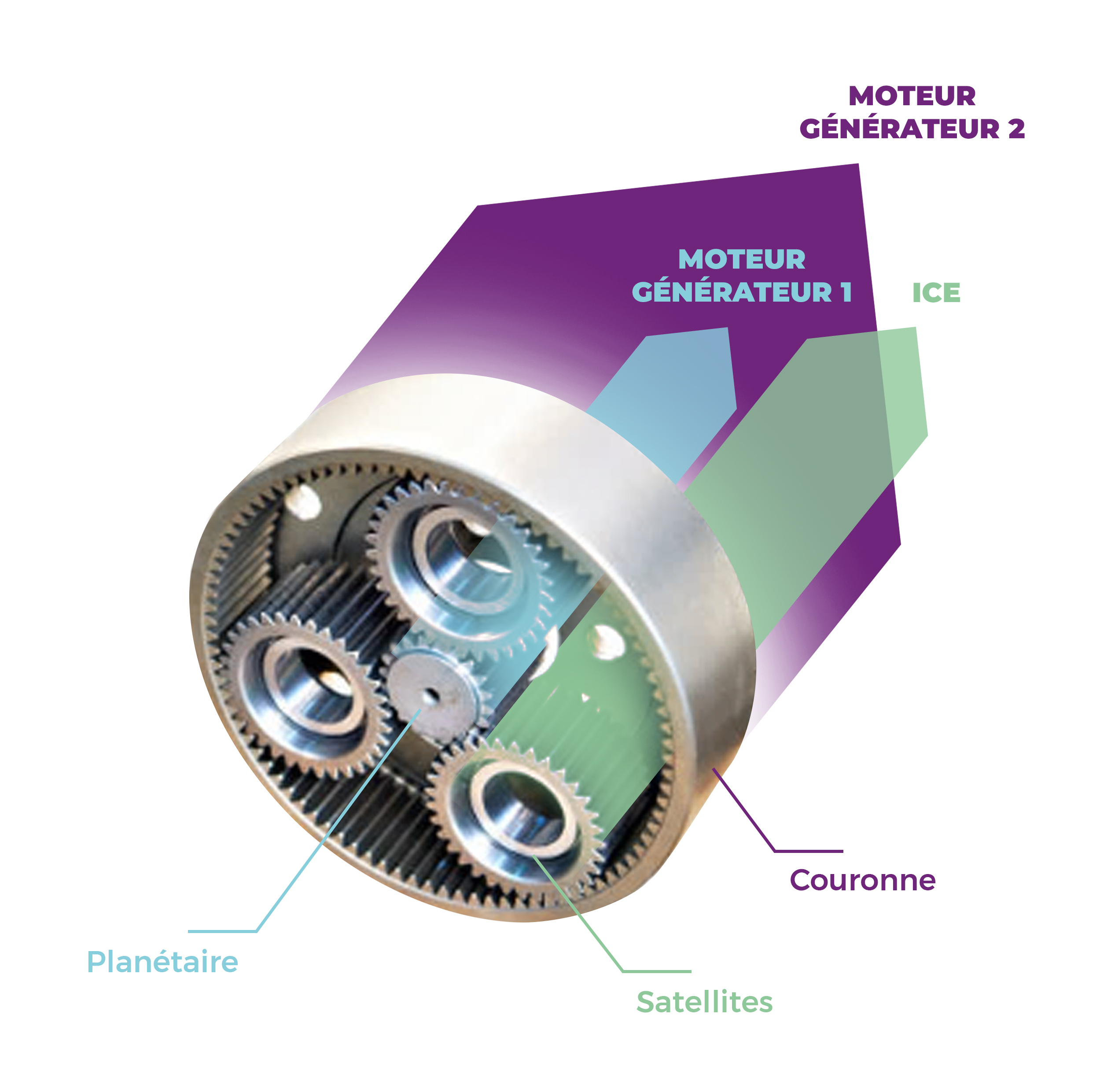 Le composant mécanique interne à la boite de vitesses qui relie et harmonise les forces de chaque moteur est le train épicycloïdal.