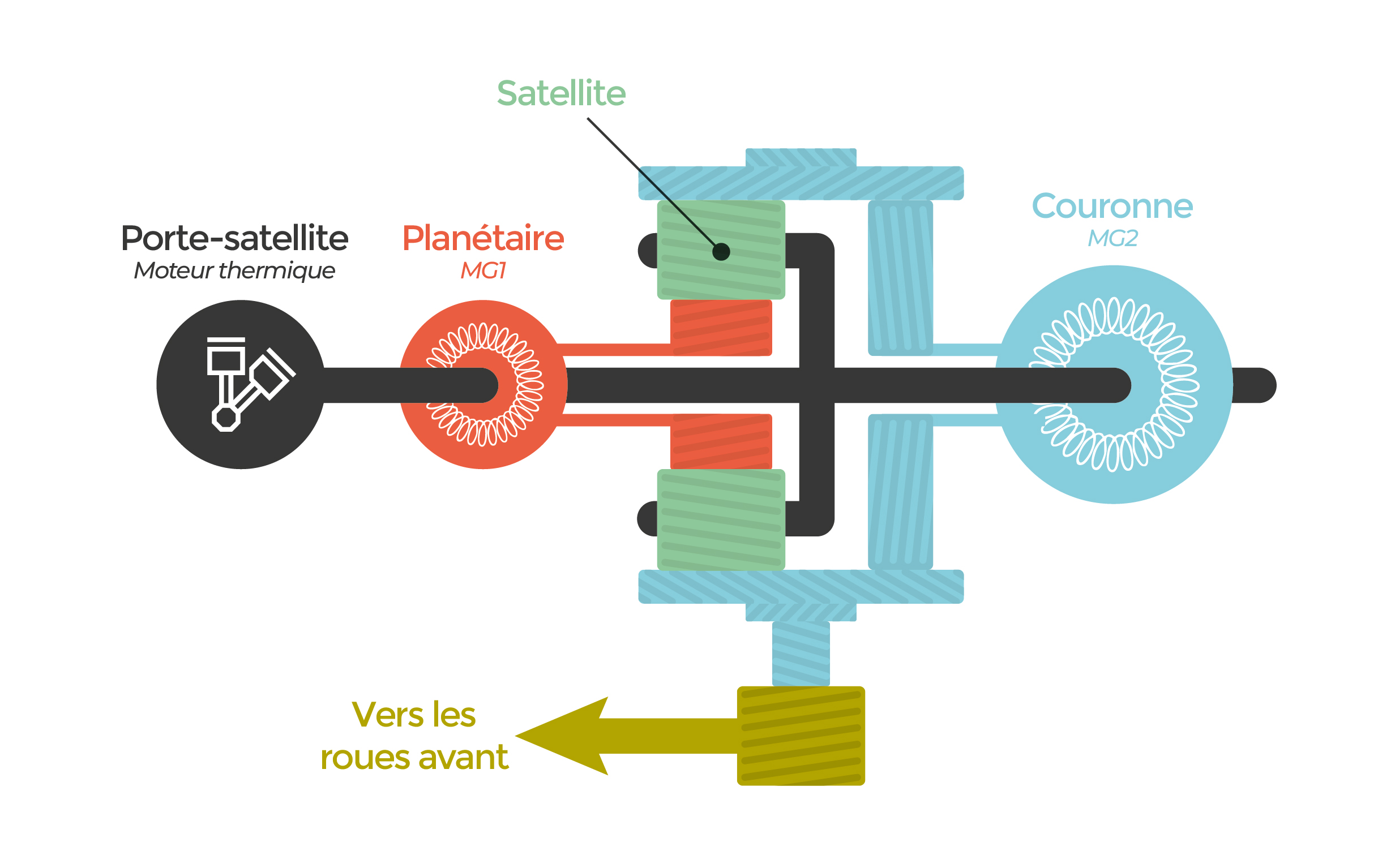 Le porte satellite transmet la force motrice du moteur thermique. Une partie de l'énergie est transférée aux roues, l'énergie restante permet de produire de l'énergie électrique par l'intermédiaire de MG1.