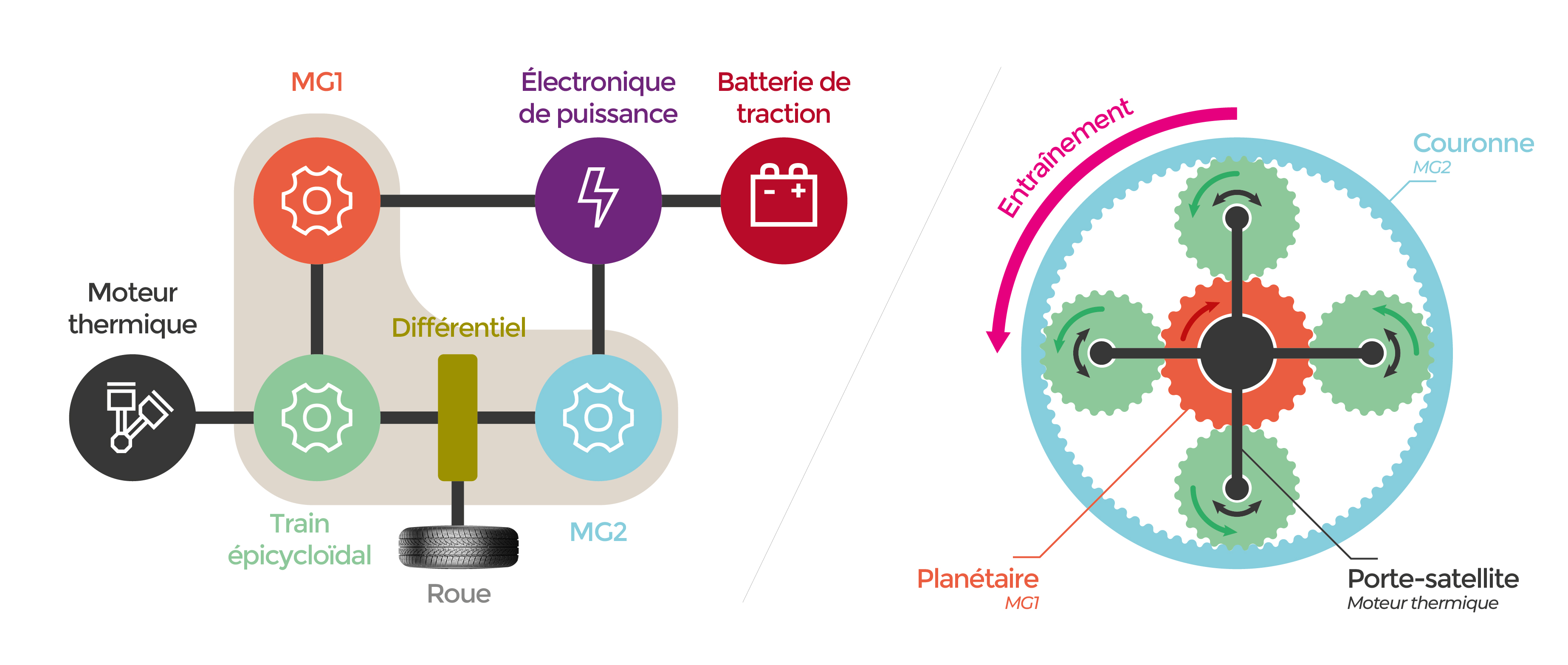 Le train épicycloïdal assure la répartition de la puissance à fournir, la récupération ou la division de puissance entre les éléments actifs (moteurs, batteries) et ceci en fonction des sollicitations du conducteur, de l'effort de propulsion ou de freinage à fournir et de l'état de charge des batteries.