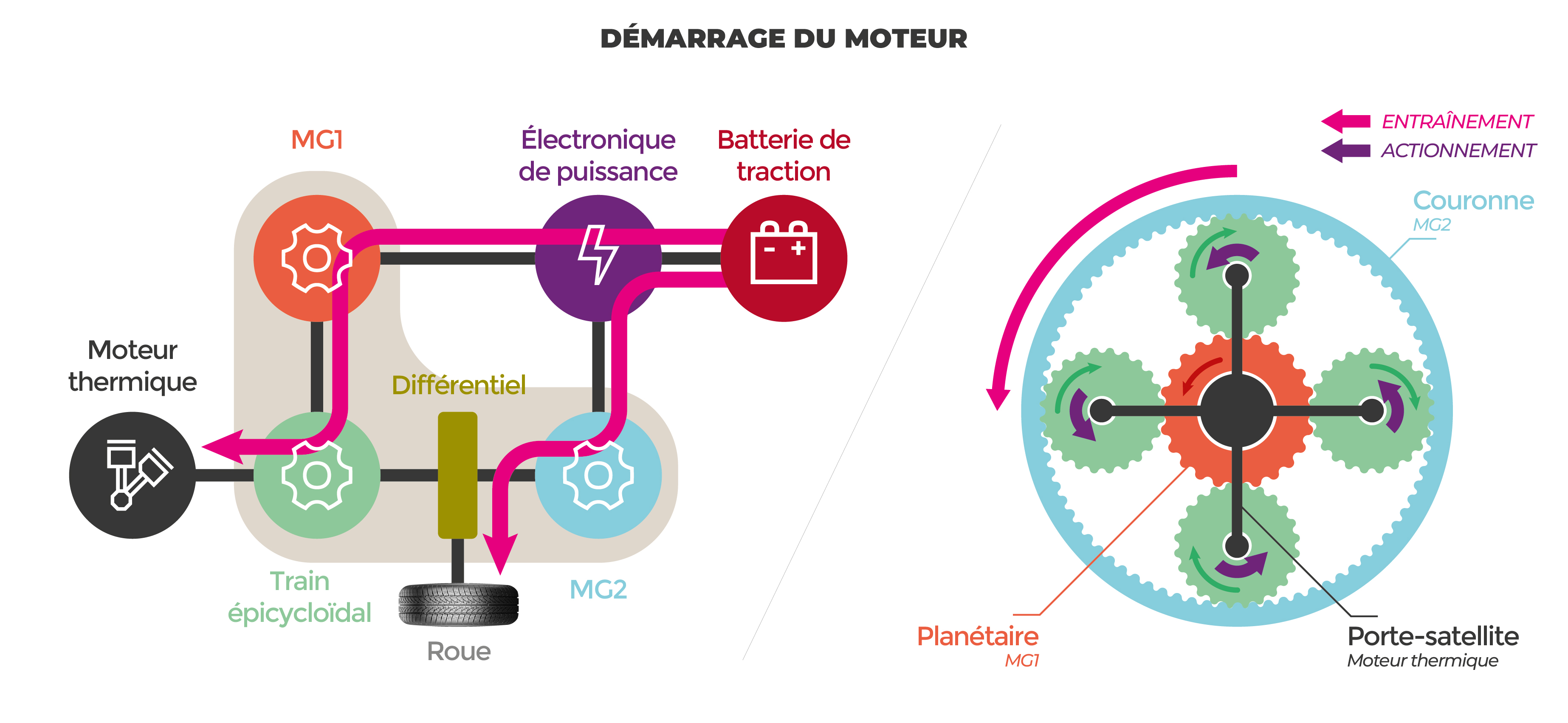 Après le démarrage du moteur thermique, MG1 devient générateur.