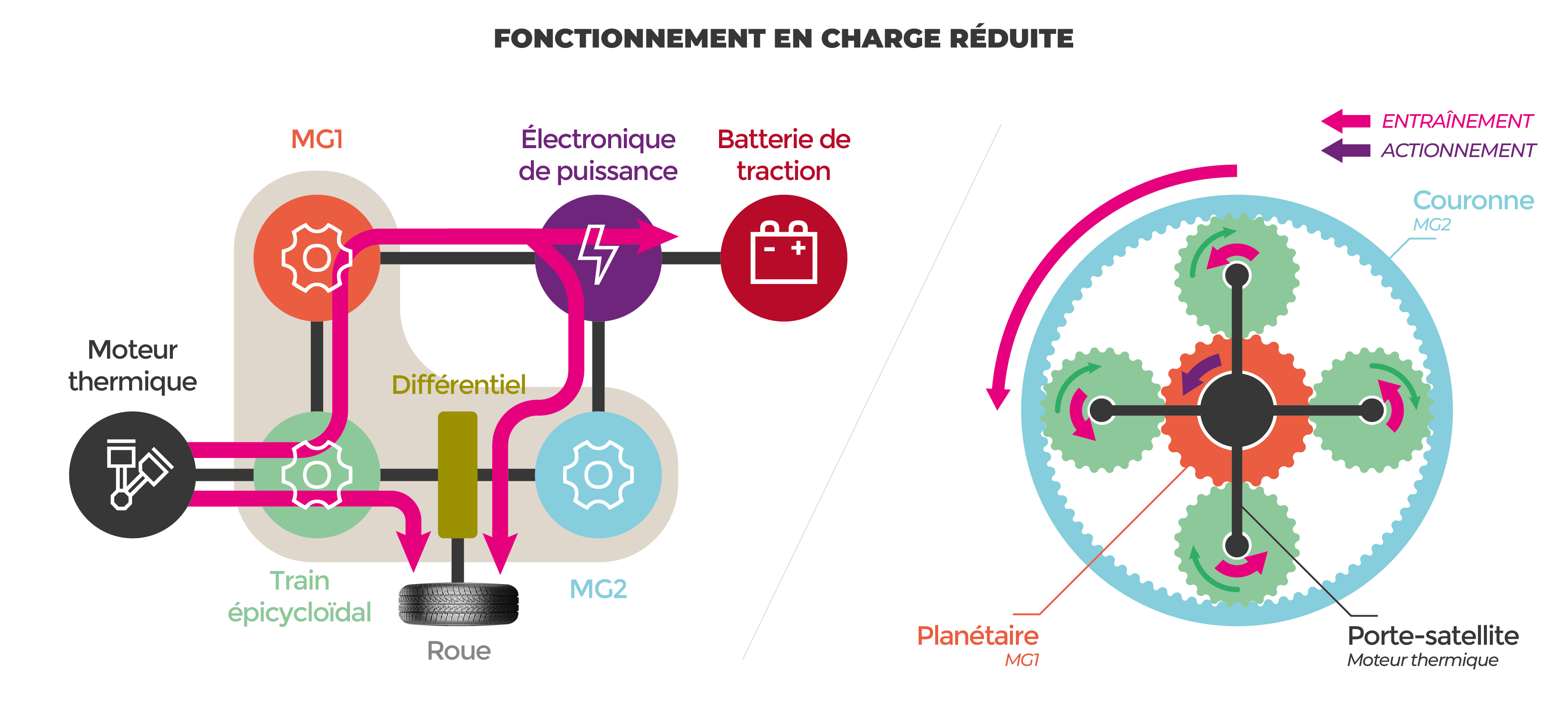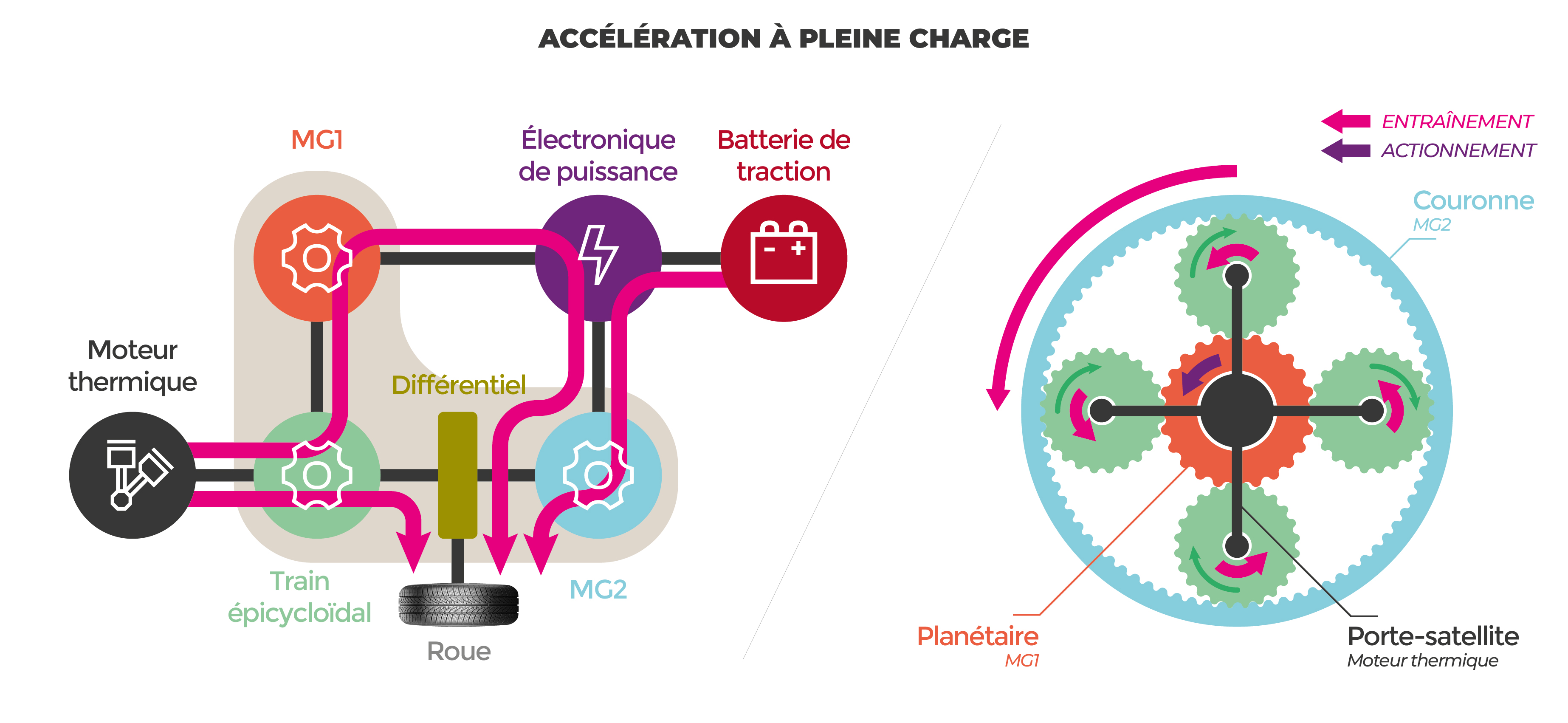 Lorsqu'une pleine charge est demandée, l'électronique de puissance augmente le couple de MG2, par un apport d'énergie électrique provenant de la batterie de traction.