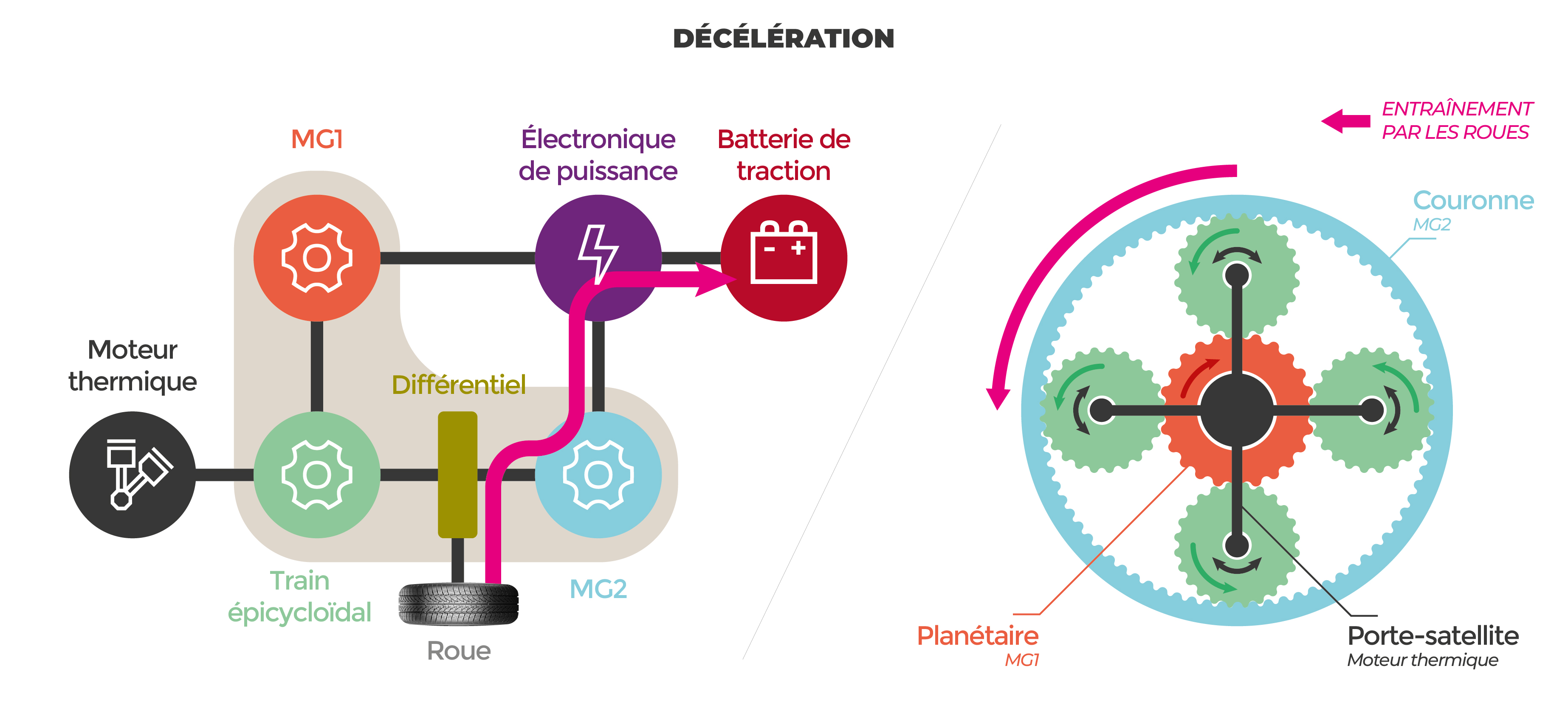 Les roues motrices actionnent MG2 qui fonctionne alors comme générateur pour la charger la batterie de traction.